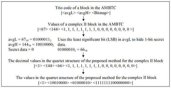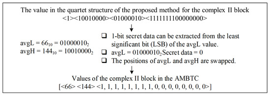 For complex II blocks, the embedding process is illustrated in Figure 8. First, read 1 bit from the secret data to be carried. The 1 secret bit is held by replacing the least significant bit (LSB) of avgL. After embedding is complete, the compression code for the block is defined as [indicator (1 bit), avgH (8 bits), avgL’ (8 bits), bitmap (16 bits)]. Set the indicator as 1 and output the corresponding stego compression code.