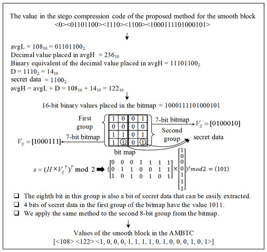 For smooth blocks, 12 bits of secret data can be extracted. Figure 10 describes the extraction process. Among these, 4 bits are hidden in the “data” position of the received stego trio compression code, and the remaining 8 bits need to be extracted from the stego bitmap. The stego bitmap is divided into three parts, as shown in Figure 5. The first and second parts are used to extract 3 hidden secret bits each using Hamming (7,4) defined by Equation (7).
