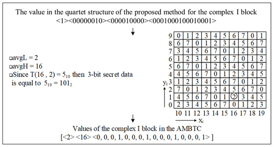 For complex I blocks, 3 bits of secret data can be extracted from the received stego trio compression code. Figure 11 describes the extraction process. This involves mapping avgL and avgH to the x-axis and y-axis of the reference matrix M. The corresponding matrix value is then converted to a 3-bit binary number to retrieve the embedded secret data.
