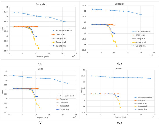 Comparison of the PSNR with the other four existing methods [3,11,21,23]. (a) Cerebrix (b) Goudurix (c) Manix (d) Phenix.