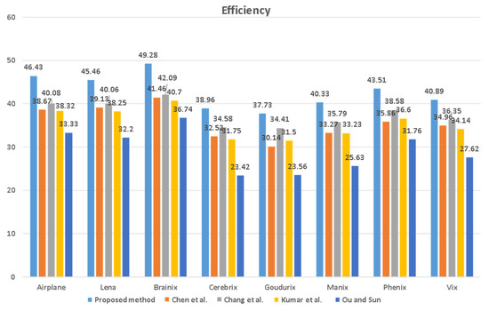 Based on the results presented in Figure 15, the proposed HPDH-MI method demonstrates significant advantages in terms of both efficiency and image quality across a range of test images, maintaining consistent performance regardless of the image type. As shown in Figure 16, the proposed method outperforms the approaches of Chen et al. [3], Chang et al. [11], Kumar et al. [23], and Ou and Sun [21] in most cases. Notably, for specific images such as Airplane and Brainix, HPDH-MI achieves higher efficiency values, indicating its potential superiority in data hiding applications for these images.