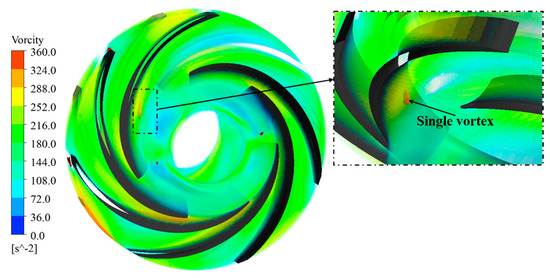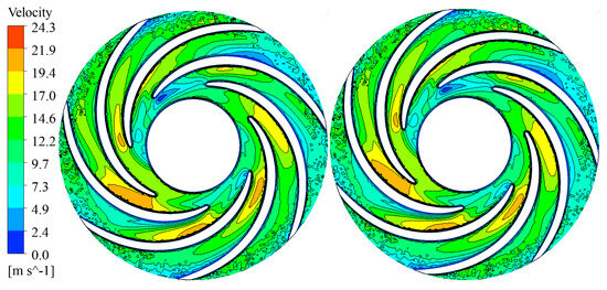 The distributions of the flow velocity and vortices in the impeller of Unit #2 under Scheme III were observed, as shown in Figure 8 and Figure 9. Under this scheme, the flow velocity distribution and vortices in Unit #2 are worse than those in Scheme II. Overall, the maximum flow velocity was <25.2 m·s−1. A large-scale single vortex formed in the blade passage, hindering water flow in specific passages. In this case, when the interlocking angle of the blades on both sides of the centrifugal pump increased to 26.57°, the flow velocity in the impeller increased relative to that in the impeller in Scheme II. This is mainly because the flow path of the fluid in the impeller is more complex and tortuous owing to the blade misalignment. The increased blade interlocking angle led to a longer flow path inside the impeller, and more vortices and turbulence were formed in the impeller flow passage. This complex flow pattern caused the relative flow velocity of the fluid to increase.