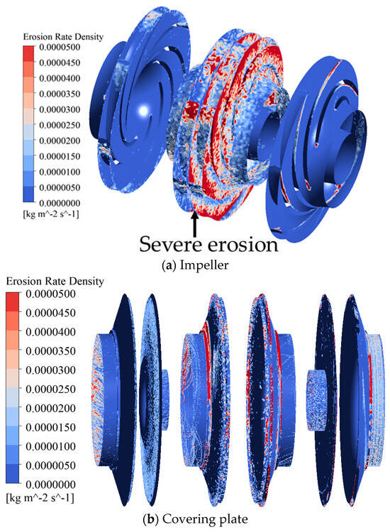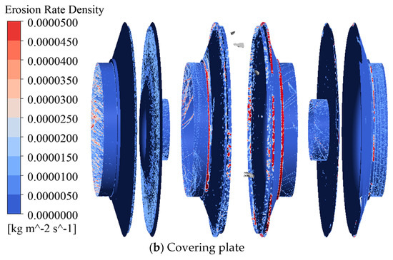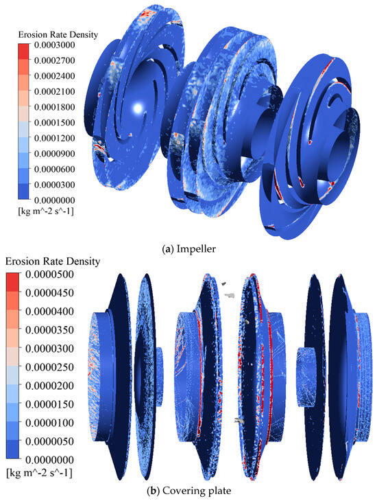 Firstly, when the impeller is installed symmetrically, the flow state inside the pump body is relatively unstable, and the scouring effect of sediment particles on the impeller surface is more concentrated, leading to increased local wear [23]. Specifically, due to the uneven velocity distribution of the fluid, there is a significant velocity gradient and turbulence in the water flow inside the pump, which exacerbates the impact of sediment particles on the impeller surface. This uneven flow can cause uneven wear on different parts of the impeller surface, increasing the risk of impeller damage and reducing pump efficiency. A poor flow state can also affect the stability of the pump, leading to increased vibration and noise.