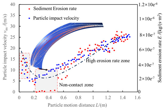 Figure 12 shows the distribution of the sediment erosion rates for various components of the unit under Scheme II. Figure 13 shows the changes in the particle impact velocity and the sediment erosion rate on the blade wall along the flow path in Scheme II. Compared to the degree of erosion observed in Scheme I, the overall positions of erosion were relatively similar. Erosion was mainly concentrated at the inlet and outlet of the blade. The erosion characteristics of the blade inlet indicate that the erosion is mainly impact erosion. In contrast, the erosion at the blade outlet is mainly frictional erosion distributed on the working surface of the blade. There was slight frictional erosion on the suction surface of the blade near the outlet side, as well as at other positions on the blade. There were varying degrees of erosion on the outlet side of the front cover plate wall, but the erosion on the cover plate wall of Unit #2 was not significant. Under this scheme, the range and degree of erosion were the lowest. The previous flow pattern analysis indicates that the relative flow velocity of particles within the impeller channel is lowest under this scheme, further supporting the conclusion that the blade interlocking angle on both sides of the impeller of Unit #2 represents the most reasonable configuration.
