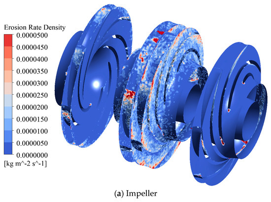 Therefore, the impact of the symmetrical installation of the blades on both sides of the impeller on pump sediment wear and energy performance remains an urgent research topic. This study aims to clarify the mechanism of the impact of the blade installation angle on both sides of the leading pump impeller on the flow and sediment erosion in the unit. Considering a three-stage centrifugal pump in Ningxia as the research object, a simulation of the solid–liquid two-phase flow inside the unit was performed at different blade angles, and the Tabakoff erosion model was used to predict the erosion characteristics. The correlation mechanism between sediment erosion and the blade installation angle under different schemes is discussed, the influence mechanism of the blade installation angle on erosion failure is analyzed, and an optimum blade installation scheme is proposed.