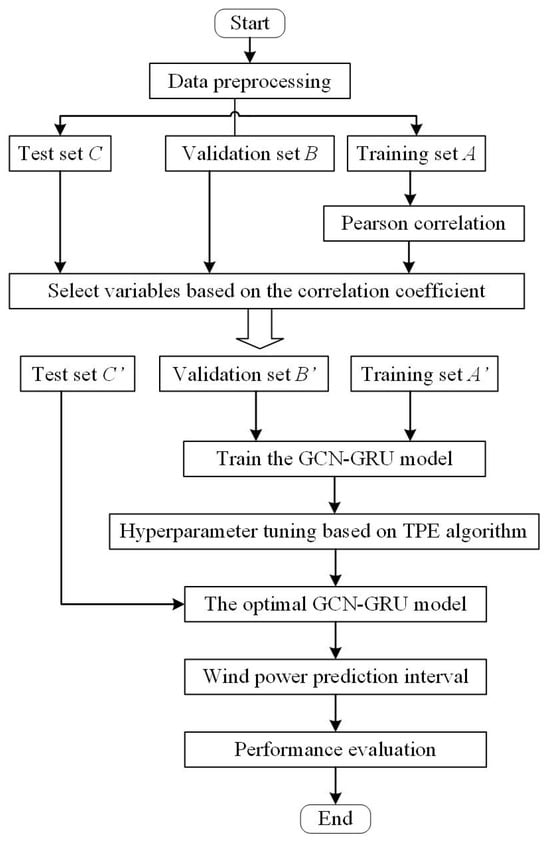 A flow chart of wind power interval prediction based on GCN-GRU.