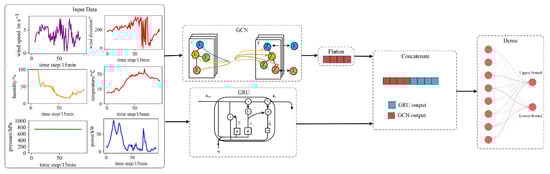 In order to make full use of the temporal and spatial characteristics of data, this subsection constructs a wind power interval prediction model based on GCN-GRU. On the one hand, GCN is able to extract representative spatial features; on the other hand, GRU can process sequence data and effectively capture the periodic changes of wind power generation over time. Therefore, by combining the constructed GCN-GRU network with the LUBE method, a more comprehensive performance of wind power interval prediction can be achieved. The structure of GCN-GRU is showed in Figure 2.