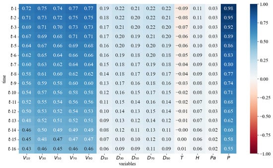 When dealing with multiple input variables, it is necessary to identify the variables that have a significant impact on the predicted power and their corresponding historical moments. Based on training set A, the Pearson correlation coefficient between the values of each variable at different sampling times and wind power is calculated, whose calculation formula is shown in (9).
