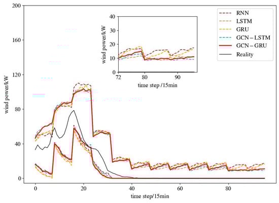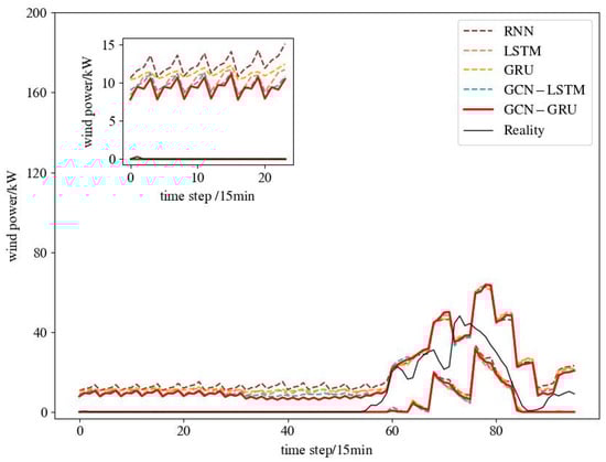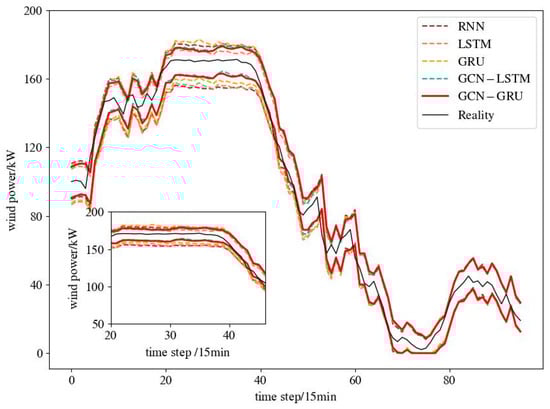 In order to more intuitively demonstrate the interval prediction performance of different models when using the improved loss function, Figure 5 shows the wind power prediction interval for a certain day in the test set. In Figure 5, the prediction intervals obtained by the six models almost all include the actual values of wind power. Among these, the prediction interval obtained based on the GCN-GRU model is the narrowest, and the actual values are closer to the middle of the prediction interval, especially from the 20th to 40th sampling time points. Therefore, from the experimental results in Table 2 and Figure 5, we can conclude that the proposed wind power interval prediction model based on GCN-GRU and the improved loss function can further improve the performance of the prediction interval while meeting the requirements of PICP.