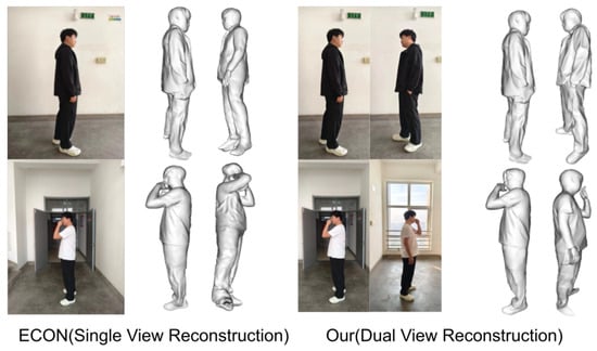 We conducted a comparative evaluation of the reconstruction effects using field data, the THuman2.0 dataset, and the THuman3.0 dataset, with the results showcased in Figure 7. With conditions of both normal and moderately complex postures and clothing, our method can accurately reconstruct the 3D human body while preserving the surface details. Compared to single-view reconstruction methods such as ECON [], the significance of integrating a back view is evident. The reconstruction outcomes from single-view methods are often compromised by blurring or incorrect predictions for the model’s back, as are particularly noticeable in ECON Figure 7a,c, where severe reconstruction errors in the upper body’s posture occur due to self-occlusion. In contrast, our dual-view approach effectively resolves these issues. As illustrated in ours Figure 7e,g, the addition of back view images allows for more realistic and detailed texturing of the back.