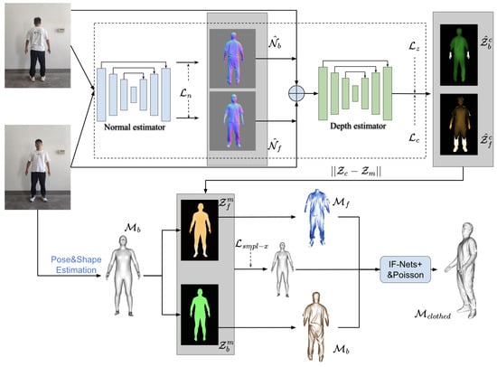 Three-dimensional (3D) human body models play a pivotal role in fields such as computer graphics, virtual reality, and human–computer interaction []. Accurately reconstructing realistic 3D human body models from images remains a challenging task that has garnered significant attention in recent years. Capturing detailed surface information while preserving the natural appearance of human subjects is crucial for applications like virtual try-on, digital entertainment, and medical simulations [,,].