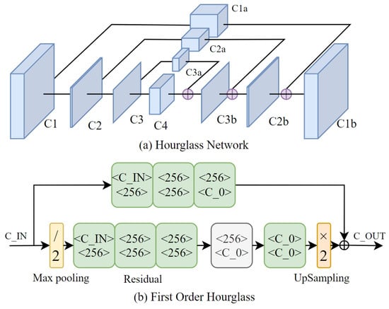 Stack hourglass network module structure. (a) represents the topology of the stacked hourglass network. (b) represents the processing flow of the first-order hourglass in the hourglass network.