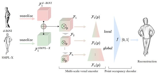 To achieve a complete and seamless human body model, we employ the implicit function network IF-Nets+ [] and Marching cubes [] to infer the fusion boundary between the anterior and posterior surfaces. The network architecture, as shown in Figure 4, takes the clothed individual’s surface and the naked mesh as the input, which are used for supervision during 3D shape inference. It applies multi-scale voxel 3D encoding to capture the global and local attributes of the generated multi-scale mesh. The deep features are then extracted, and based on these features, the decoder predicts whether a point lies inside or outside the surface.