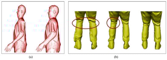 Based on the results shown in Figure 8 from the human-nerf [] example, although it can generate pixel frames from different viewpoints, it has strong input dependency and is not editable. The number of input frames is directly proportional to the rendering outcomes. The outputs of human-nerf are not meshes or point clouds. Although point clouds and meshes can be indirectly generated through methods like NeRF2Mesh [] or NerfStudio [], the quality of the transformed meshes and point clouds is not high, and the rendering incurs high computational costs and significant time consumption. In contrast, our method directly generates meshes with a certain level of editability. Additionally, our method consumes very little time in high-response applications, rendering a set of results in just 3–5 s on a NVIDIA Tesla V100 (NVIDIA Corporation, Santa Clara, CA, USA). Even on a GeForce RTX 2080 (NVIDIA Corporation, Santa Clara, CA, USA), reconstruction results can be obtained in 5–8 s. The surface reconstruction details of our method, which meet the requirements for generating animation models, are already demonstrated in Figure 7. These results show that our approach can produce highly accurate and detailed reconstructions, making it suitable for applications such as virtual try-on, character modeling, and other animation-related tasks.
