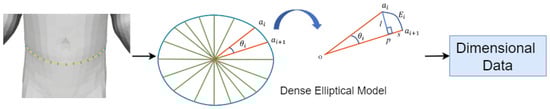 Additionally, we provide results for several subjects with varying body indices in Table 3, comparing the differences in measurements such as chest circumference, waist circumference, and thigh circumference with the actual sizes. These results show that most of the shape measurement errors are under 1 cm, with average length measurement errors of generally below 0.5 cm. Notably, the larger errors observed in the circumference measurements are not due to limitations in our method but are instead related to the measurement technique. Specifically, circumference measurements use a dense elliptical model, where the high number of points selected can introduce minor discrepancies. In contrast, length measurements, based on simple two-point distance calculations, naturally show lower errors. As illustrated in Figure 6, the measurement principle treats closed circumferential dimensions as the result of joining elliptical curve segments with varying coefficients. By summing the elliptical segments of different curvatures, we derive closed circumferential measurements; the detailed reasoning and calculations for this approach have been addressed in prior work []. Going forward, we aim to refine our proposed dense elliptical model to minimize these differences further.