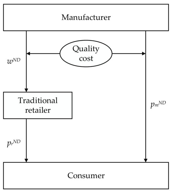 ND Mode: Retain the traditional retail channels, add online direct sales channels, place the manufacturers at unit price in the direct sales channel, and generate unit direct sales costs [32]. At the same time, wholesale products are sold to retailers at the unit wholesale price wND( > wND); retailers then sell at the unit price of , and traditional retail channels and online direct sales channels sell the same product.