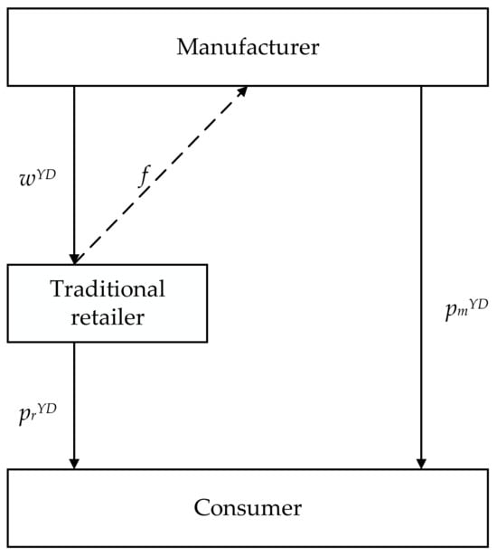 YD Mode: Introduce blockchain technology to upgrade the original network platform so that it has the functions of inspection and sales at the same time [33]. Similarly, maintaining traditional retail channels and opening online direct selling channels, manufacturers sell through direct selling channels at a unit price of . Since the transformed network platform has the sales function, no unit direct selling cost is generated in the sales process; retailers buy products at the unit wholesale price wYD( > wYD) and sell them at the unit price . Traditional retail channels and online direct sales channels sell the same product.