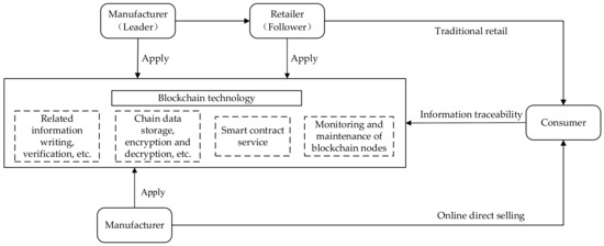 Nir and Tian Feng suggest that implementing blockchain technology in the supply chain will enhance transparency and accountability, thereby boosting customer trust in product attributes [13,14]. Kshetri et al. synthesized the manner in which blockchain technology influences the management objectives of the supply chain and indicated that blockchain technology contributes to the circular economy in multiple respects [13]. Su et al. and Wang et al. discussed the introduction of blockchain technology into the field of supply chain finance [15,16]. Dutta P. et al. asserted that blockchain possesses substantial potential for transforming supply chain (SC) functions, spanning from supply chain provenance and business process reengineering to security enhancement [17]. Liu et al. studied the role of blockchain in the supply chain of imported fresh food, and combined with the risk attitude of decision makers, gave the conditions for using blockchain to make profits under each model [18]. Chandan A et al. have introduced blockchain into the food supply chain, where blockchain technology improves the sustainability of the food supply chain by providing a transparent traceability system [19]. Oriekhoe OI elucidates how blockchain technology can efficaciously resolve the problems of inefficiency, opaque processes, and vulnerability to fraud in the traditional supply chain ecosystem [20].
