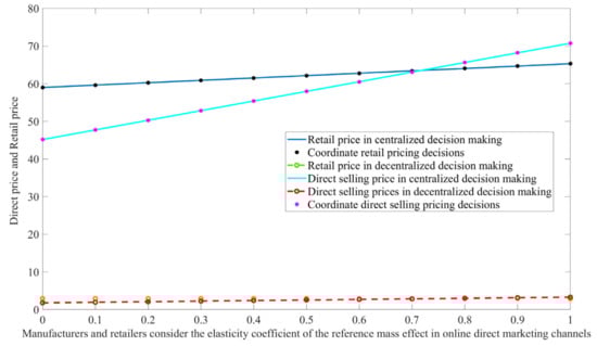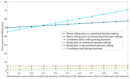 The findings presented in Figure 4 and Figure 5 indicate that the equilibrium price achieved through centralized and coordinated decision-making is greater than that found in decentralized decision-making. This occurs because centralized decision-making aims to maximize the total profit of the supply chain system, while coordination via a two-part pricing contract enables the equilibrium price to match that of centralized decision-making. In contrast, decentralized decision-making results in each channel focusing on its own profits independently. Within the Steinberg game framework, where the manufacturer serves as the leader and the retailer as the follower, manufacturers typically focus on optimizing output to achieve maximum profit. Additionally, the elasticity coefficient of this effect positively influences the equilibrium prices across each channel in the dual-channel system.