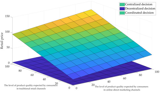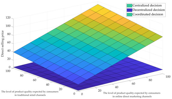 3. Take and , respectively, to get Figure 6 and Figure 7. Figure 6 and Figure 7 show that improvements in qm and qr lead to an increase in equilibrium prices for both traditional retail channels and online direct selling. This suggests that reference quality positively influences the equilibrium prices across all channels within a dual-channel supply chain. Therefore, regardless of which channel enhances consumers’ perceptions of reference quality, a suitable rise in selling prices in another channel will result in greater profits. As shown in Figure 8, the impact of qm on direct selling prices is more significant than that of qr, with direct selling prices calculated solely based on qm being lower than those derived from considering both factors. Likewise, Figure 9 indicates that the influence of qr on retail pricing exceeds that of qm, as retail prices determined only by qr are less than those established by including both variables in traditional retail contexts.