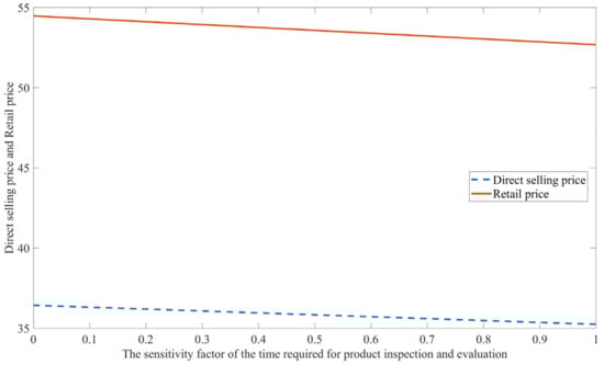 4. Take to get Figure 8. Figure 8 shows that with the adoption of blockchain technology, as the sensitivity coefficient of the time required for product inspection and evaluation increases, the equilibrium prices of traditional retail channels and online direct sales channels decrease, which is due to the long time required for product inspection and evaluation, resulting in partial loss of potential market demand. Manufacturers and retailers need to cut their losses and attract consumers by lowering their own prices.