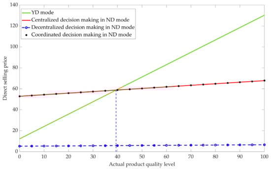 3. Take to get Figure 14. Figure 14 shows that the actual product quality level must align with consumers’ expected quality levels in the online direct marketing channel. In ND mode, as actual product quality rises, the manufacturer’s profit declines. Conversely, in YD mode, an increase in actual product quality leads to higher profits for the manufacturer.