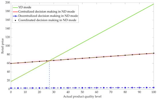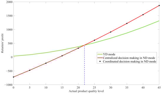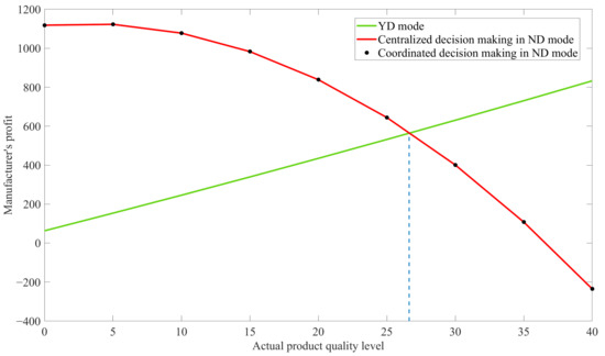 As can be seen from Figure 14, the relationship between manufacturer’s profit and the actual product quality level is as follows: If , ND mode > YD mode. If q = 26.73, ND mode = YD mode. If , YD mode > ND mode. As can be seen from Figure 15, the relationship between retailers’ profit and the actual product quality level is as follows: If , YD mode > ND mode. If q = 21.94, ND mode = YD mode. If , ND mode > YD mode. As can be seen from Figure 16, the relationship between manufacturer’s profit and the actual product quality level is as follows: If , ND mode > YD mode. If q = 43.62, ND mode = YD mode. If , YD mode > ND mode.