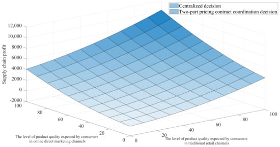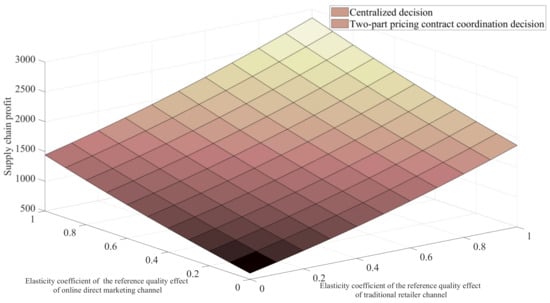 1. Take and and and , respectively, to get Figure 11 and Figure 12. Figure 11 and Figure 12 show that supply chain coordination consistency is achieved through a two-part pricing contract. The surface graph indicates that the profits of the supply chain under this model align perfectly with those in centralized decision-making. Additionally, enhancements in λ1, λ2, qm, and qr contribute to increased supply chain profits. Therefore, decision-makers should prioritize reference quality to satisfy consumers’ ongoing demand for quality improvement. While price competition remains unavoidable for businesses, as people’s living standards rise, companies must focus more on their intrinsic value. To address diverse consumer demands effectively, continuously enhancing product quality becomes crucial for improving corporate reputation and securing market position.