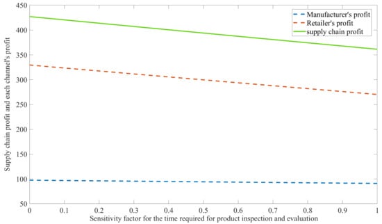 2. Take to get Figure 13. Figure 13 shows that with the implementation of blockchain technology, an increase in the sensitivity coefficient related to the time needed for product inspection and evaluation leads to a decline in profits across all channels, as well as overall supply chain profits. This occurs because certain consumers are reluctant to wait for the necessary inspection period, resulting in a loss of market share.