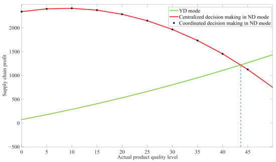 5. Take to get Figure 16. Figure 16 shows that under the ND model, supply chain profit decreases with the increase of actual product quality. Under the YD model, supply chain profit increases with the improvement of actual product quality.
