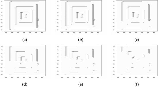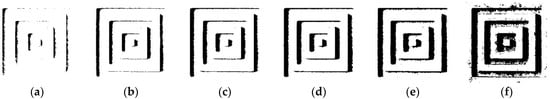 We collected traditional carving images from the culturally rich Southern Anhui Province, a region known for its diverse range of carvings on stone, brick, and wood. Due to different collection techniques, methods, and equipment, such images usually have different views and scales. Furthermore, due to natural erosion over many years, many carving images have distinct levels of damage. We therefore conducted some operations to repair and enhance image features. We then made color and channel-wise adjustments to sample images by converting their image mode from color value matrix to brightness value mode, performing brightness feature enhancement and binarization processing. It used the following specific method to realize binarization processing. When the brightness value of a pixel was lower than a set threshold, we set the brightness value as 0. Otherwise, we set the brightness value as 255. This method preserved different parts of the image as adequate information when the threshold was set to different values, affecting the image feature extraction results. For example, taking a carving image of the “回” character, we conducted binarization processing to preserve the practical part of the image when the threshold was set to different values, as shown in Figure 5.