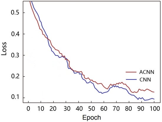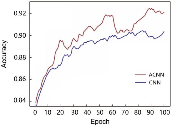The training and loss curves of CNN and ACNN models on the large-scale ImageNet are shown in Figure 6 and Figure 7. We can see that the ACNN performed better in model efficiency and loss function as the training epoch increased. We further optimized network model parameters according to the training process to improve the model efficiency and image clarity.