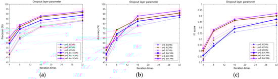 Partial indicators variation with changes in iterations (n) and Dropout layer parameter (p). (a) Precision indicator changes. (b) Accuracy indicator changes. (c) F1 score changes.