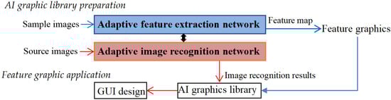 Based on the proposed image feature extraction and recognition method, we conducted intelligent graphic design and application, mainly including AI graphic library preparation, and feature graphic application. For preparation, the sizes of sample images were equalized before being input into the adaptive feature extraction network (AT-CNN) for image feature extraction. Use of this method ensured efficient extraction of features. According to the output feature maps, dynamic feature graphics were created and restored into corresponding categories to establish an AI feature graphics library. For application, source images were input into the adaptive image recognition network (AT-ACNN) for recognition. Its dynamic feature graphic was then called from the AI library according to the recognition results and applied to the GUI design. A flow chart of this process is shown in Figure 9, in which the blue arrows connect the preparation process, and the red arrows connect the application process.