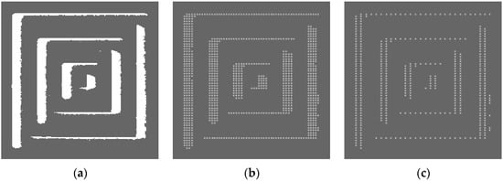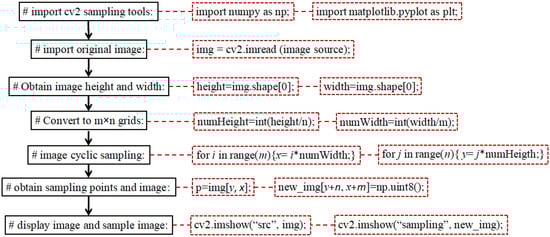The creation of an AI graphic library requires a large number of dynamic feature graphics based on their feature maps. Using the traditional carving pattern of the “回” character, we demonstrated the specific process of feature graphic creation. Based on the feature map output from the model as shown in Figure 10a, we conducted the feature point sampling and optimization in the X direction, obtaining the feature points matrix visually presented in Figure 10b and Figure 10c, respectively. Feature graphics were created by connecting the critical feature points under specific conditions after a certain degree of smoothing processing. The specific methods for image feature point sampling in the python environment is shown in Figure 11.