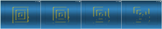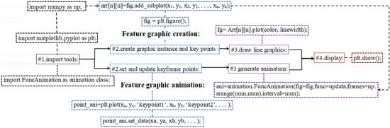 Furthermore, dynamic feature graphics were generated to create the AI graphic library. The process involved setting the duration, identifying key motion points, applying the animation method, and smoothing transitions between different states of an image. This resulted in a dynamic feature graphic, with a specific motion mode that drove the endpoint of each line segment moving close to the starting point. Figure 12 shows the frame screenshots of the dynamic feature graphic of the “回” character with a duration of 1 s (containing 24 frames) created by this method. The specific method for generating dynamic graphics based on critical feature points in the Python environment is shown in Figure 13.