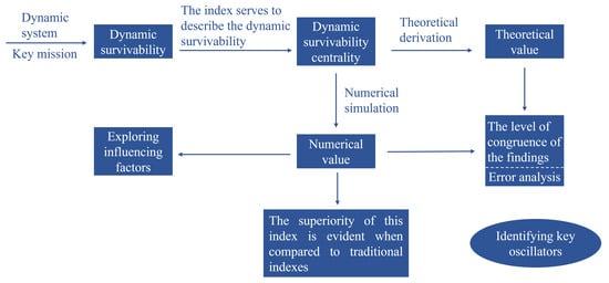Motivated by these facts, our objective in this paper is to offer a concept of dynamic survivability centrality to identify the ability of an oscillator to affect dynamic survivability of the dynamic system, thereby addressing the limitations inherent in conventional centrality indices.The definition of dynamic survivability centrality is first reported in Section 2, and the expression is derived from the coupled Stuart–Landau oscillator systems when the key mission to complete is synchronization. In Section 3, the dynamic survivability centrality analysis and the comparison with classic indexes to test the performance of our index are illustrated. The results demonstrate that the proposed index is more effective in assessing the significance of elements within dynamic systems, while also providing insights into the factors influencing this index. And Section 4 summarizes the conclusions. The diagram block for methodology is depicted in Figure 1.