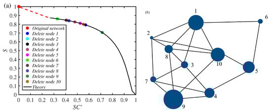 In order to illustrate the correctness and necessity of the constructing index, the dynamic survivability centrality analysis of an ER system with ten oscillators is firstly carried out. As shown in Figure 2a, the mission completion probability is when the oscillator is not attacked, which depicts the probability of the system completing the key mission of synchronization is 1, i.e., the system is highly survivable. Then, each oscillator is removed separately. It can be seen that the value of the normalized dynamic survivability centrality index is different when different oscillators are removed. The larger the is, the smaller the corresponding mission completion probability S is, which means that the dynamic survivability of the coupled nonlinear oscillator system is changed more. From the perspective of system dynamic survivability, the corresponding oscillator needs more attention in the system. The black solid line represents the result of theoretical derivation, which is in good agreement with the numerical result, verifying its correctness.