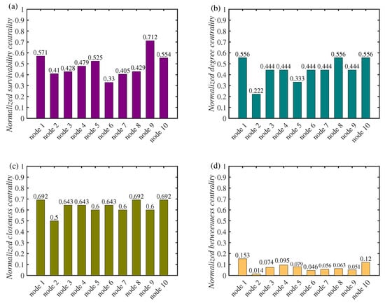 The findings of these studies suggest a strong correlation between dynamic survivability and the oscillators (nodes), i.e., the failure of oscillators leads to a reduction in dynamic survivability. Nevertheless, it is evidently impossible to protect all oscillators to enhance the dynamic survivability of dynamic system. As widely acknowledged, the functionality of various system mechanisms, including cascade failure, diffusion propagation, and synchronization, will be affected by the action of a small number of nodes [,,,,,]. It follows naturally that the same is true of dynamic survivability. Identifying these nodes with significant effects both theoretical significance and practical value. In fact, this is what is known today as centrality, which reflects the nodes occupying key positions in the entire network system, and the definition of centrality is well understood. In real life, centrality is always associated with excellent leadership, popularity or reputation [,]. Moreover, the greater the centrality attributed to individuals, the higher their access to convenience and influence within social networks [,].