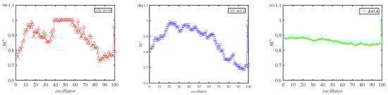 The results presented in Figure 4 demonstrate the normalized dynamic survivability centrality index obtained by removing each oscillator under increasing connection density , and . It is observed that when the connection density is relatively small, the red and blue lines calculated according to Equation (6) change obviously, which means the importance of each oscillator is relatively different. And the value of dynamic survivability centrality will become closer accompanied by the increase in the connection density, which is shown in green curve. That elucidates that the reduction in connection density of the system diminishes the significant disparities among oscillators. The reason behind this phenomenon is that as the connection density of the ER network increases, it approaches a globally coupled network, resulting in a more uniform distribution of oscillator degrees and closer proximity of oscillators within the system.