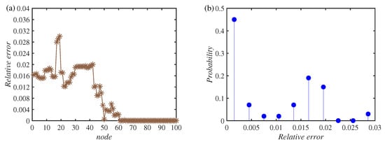Error analysis of dynamic survivability centrality (, ), embodying the correctness of theoretical derivation. (a) Relative error value corresponding to each oscillator. (b) Distribution of errors.