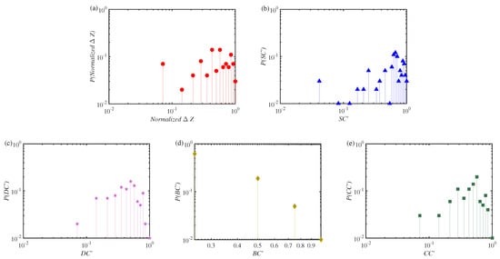The distribution diagrams of state of system and centrality indexes (, ), which prove the superiority of dynamic survivability centrality. (a) Normalized distribution of . (b) Normalized distribution of dynamic survivability centrality. (c) Normalized distribution of degree centrality. (d) Normalized distribution of closeness centrality. (e) Normalized distribution of betweenness centrality.