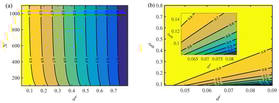 At the end of this section, the impact mechanism of system topology parameters on the dynamic survivability centrality is investigated. We visualize Equation (11) by contour plots in Figure 8. An increase in connection density calculated after attacking each oscillator leads to a smaller value of normalized dynamic survivability centrality with fixed initial connection density . It tells us that connection density has a weakening effect on dynamic survivability centrality. The reason is that the larger the is, the closer it approaches , indicating a minimal change in system connection density upon removal of oscillator i. This implies that the effect on the dynamic survivability is weak, so the oscillator is of little importance, thereby causing a small value of . Additionally, the increase in system size will promote the dynamic survivability centrality, albeit the magnitude of this beneficial impact is relatively small exhibited by flat growth curve. While the impact of initial connection density on dynamic survivability centrality depends on the value of . Specifically, enhances the dynamic survivability centrality when is high, while remains unchanged when is low.