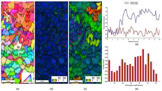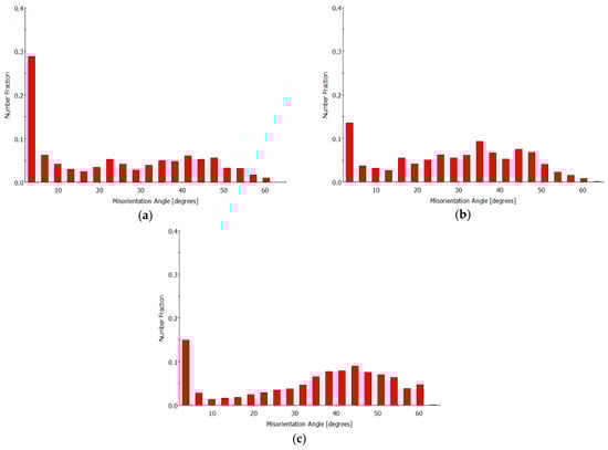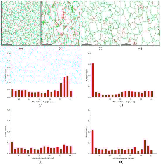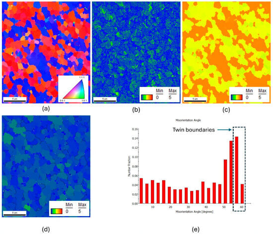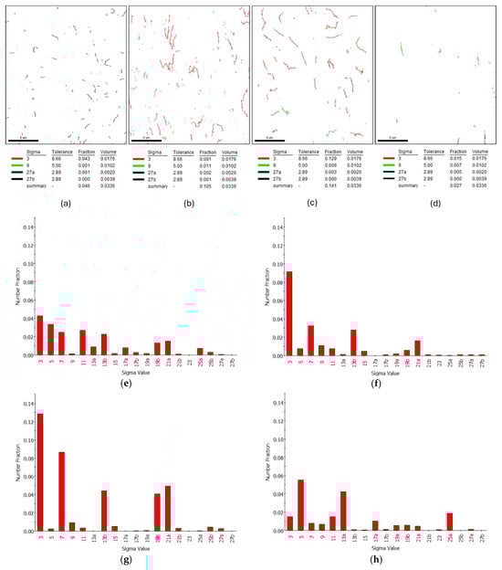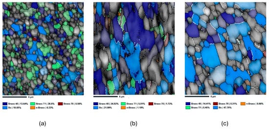 - After 2 h of annealing, Brass and Brass45° grains dominated the microstructure, with the Σ3 CSL boundary fraction increasing to approximately 12.9%. The texture component map reveals that these boundaries primarily separate the Brass and Brass45° grains, supporting the link between the Brass texture dominance and the rise in Σ3 CSL boundaries.