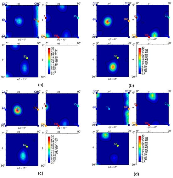 | Texture Component | Cube {001}<100> (%) | Goss {011}<100> (%) | Brass {110}<112> (%) | Copper {112}<111> (%) | S {123}<634> (%)  | R. Goss (RG) {011}<011> (%)  | R. Brass (RB) {110}<556> (%) | A {112}<110> (%)  |