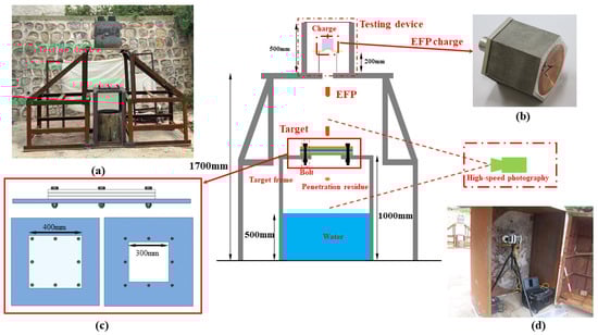Experimental setup: (a) layout of test site; (b) EFP shaped charge; (c) structure of target and support target frame’s panel; (d) high-speed photography.