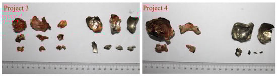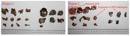 In the four experiments, the initial impact velocities of EFPs were 1627 m/s, 1632 m/s, 1635 m/s, and 1621 m/s, respectively, which were relatively consistent, with small fluctuations. The residual velocities of EFPs after impact were 346 m/s, 481 m/s, 475 m/s, and 528 m/s, indicating that there were differences in the anti-penetration capabilities of different target combinations. Figure 2 presents the residual EFP and behind-target fragments recovered from the experiment. As anticipated, the fragmentation of EFPs during penetration led to producing the main body of residual EFPs and numerous copper fragments of inconsistent sizes after penetrating into the steel targets. Notably, the number of EFP fragments behind the target in Project 4 was substantially lower compared to the other projects. By conducting a comparative analysis of the damage patterns and deformations of the composite targets, the dynamic response characteristics of different target combinations subjected to high-velocity impacts from EFPs were further investigated.