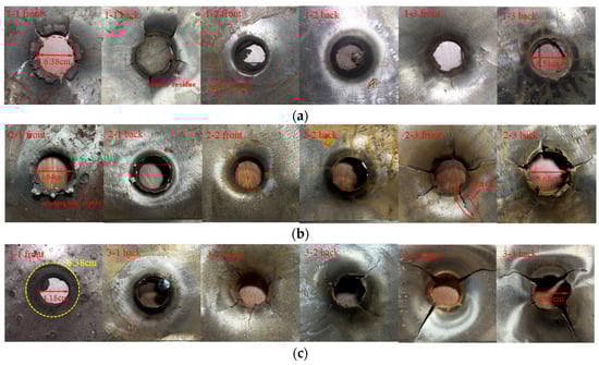 Figure 3 illustrates the surface damage morphology of EFPs penetrating three combinations of three-layer composite steel targets. As shown, the first layer, under high-velocity impact from an EFP, experienced plastic flow to the upper surface of the target due to the compression of the target material by the projectile, forming a flanging. This flanging phenomenon gradually weakened with increasing target thickness, as seen in Project 1 and Project 2. When the thickness of the first layer increased, the flange disappeared, giving way to a surface spalling area approximately 1.5 times the crater diameter, as demonstrated in Project 3. Additionally, for the thin targets, during high-velocity penetration, the circumferential tensile stress generated by the radial expansion of the first layer material caused several radial cracks near the crater, which did not occur in Projects 2 and 3. When the thickness of the first layer was larger and the thickness of the middle layer was the same, the middle layer exhibited some degree of radial tensile cracks, indicating the presence of a large tensile force at the concave fracture; when the thickness of the first layer was smaller, more copper remainder appeared around the inner wall of the crater, which was related to the changes in target failure. Under the three operating conditions, the three-layer target exhibited varying degrees of cracks, and the extent of crack tearing increased gradually with the increase in the front–rear target thickness ratio. Comparing the crater diameters of entering and exiting the target under the three operating conditions, the crater diameter of entering the target decreased with the increase in the front–rear target thickness ratio; the crater diameter of exiting the target was largest in Project 1 and smallest in Project 2.