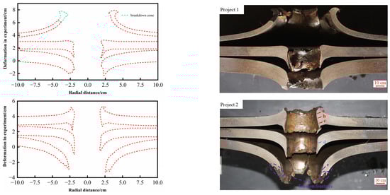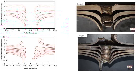 The deformation profiles of the first three projects in the experiment were compared, and the curves of deformation size as it varied with the radial length of the target were plotted, as shown in Figure 4. From the macroscopic deformation of the multi-layer target profile, the composite target with a front–rear target thickness ratio of 1 also showed less local plastic deformation along the EFP impact direction than other composite structures, with the overall deformation being the smallest. Additionally, severe tensile fractures appeared at the exit of the rear target. Thicker targets had a significant effect on the bending of thinner front targets along the projectile impact direction [], wherein both the first layers in Project 1 and Project 2 exhibited bending deformations opposite to the velocity direction of EFP, particularly severe in Project 1. The supporting effect of thin targets on the front target was significantly lower than that of thick targets, resulting in the order of downward bending deformation of the middle targets being Project 3 > Project 2 > Project 1, when the thickness of the first layers was consistent in Project 1 and Project 4, the deformation shapes remained basically the same and were not closely related to the number of layers in the rear target. Comparing Project 2 and Project 4, when the target thickness of each layer was consistent, the backer the layer sequence of the targets in the sequence, the more obvious its tensile deformation after being impacted by EFP.