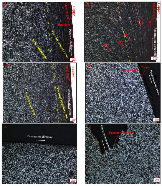 Metallographic micrograph of the crater edge on each layer of the targets. The figures (a–f) correspond to the six a–f positions of project 2 in Figure 4.